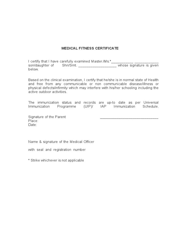 Effect from …………… is absolutely necessary for the restoration of his/her health. Upload the pdf you need to esign. Certify that i have carefully examined mr./ mrs ………………………., son/daughter of ……………………… Medical fitness certificate (to be signed by a registered medical practitioner holding a degree not below that of m.b.b.s.) (to be submitted at the time of admission) copyright: 5 steps to prepare a medical fitness certificate step 1:. Provide a proper heading to the document sample.